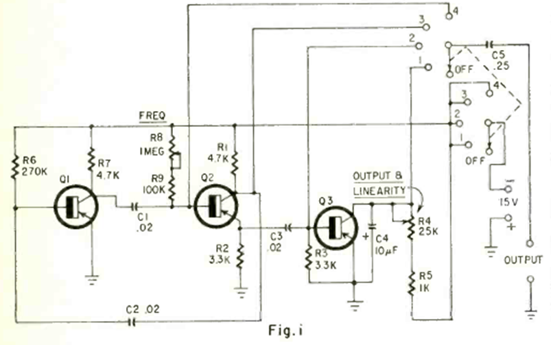 Encontramos este circuito en la revista Radio Electronics de enero de 1970. Los transistores son de propósito general y la frecuencia generada oscila entre 100 Hz y 1 kHz. Los componentes se pueden cambiar a otros rangos de frecuencia.