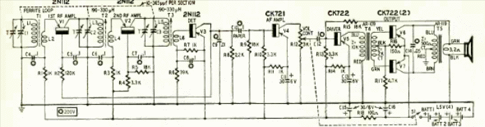 Este circuito para el rango de onda media salió en una Radio Electronics de febrero de 1958. El circuito de alta sensibilidad utilizaba transistores de la época y funcionaba con batería. Vea ángulos de sintonización del variable detallados