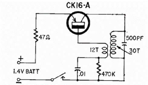 Este circuito oscilador de bloqueo se encontró en Radio Electronics de noviembre de 1963. La frecuencia depende de la bobina y se puede utilizar cualquier transistor de propósito general. La potencia es muy baja.