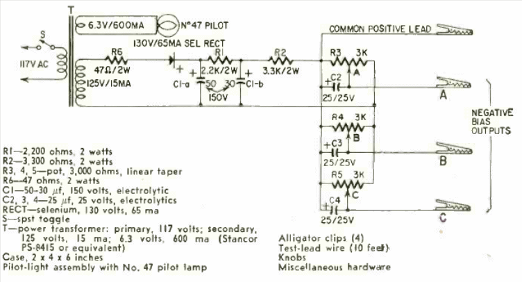 Este circuito se encontró en la revista Radio Electronics de mayo de 1959. Su propósito es proporcionar voltajes de polarización para los circuitos bajo prueba. El circuito está aislado de la red eléctrica.