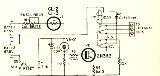 Este temporizador de 1 transistor se publicó en la revista Radio Electronics en diciembre de 1960. El circuito tiene contactos reversibles y funciones de bloqueo y funciona con baterías.