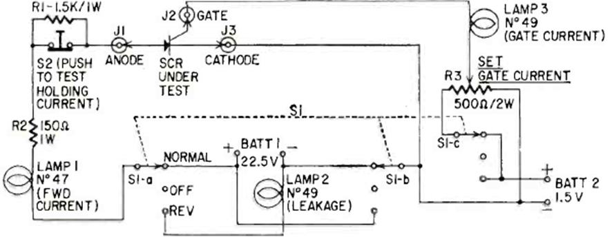 Este circuito se publicó en la revista Radio Electronics en junio de 1964. Es adecuado para probar SCR en ese momento, pero también se pueden probar tipos modernos siempre que estén dentro de las características esperadas por el diseño del probador.