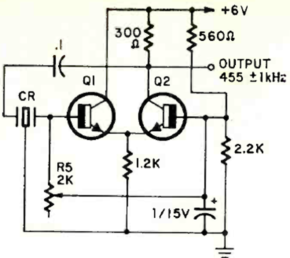 Este oscilador que utiliza un filtro cerámico de 455 kHz se encontró en la revista Radio Electronics de mayo de 1970. El circuito utiliza transistores de uso general de la época y tiene una precisión de 1 kHz.