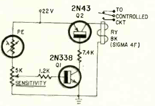 Este circuito es de Radio Electronics de octubre de 1963. El LDR y los transistores son de la época, pero el circuito se puede ensamblar con componentes equivalentes modernos. La tensión de alimentación depende del relé utilizado.