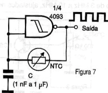 El oscilador CMOS ilustrado en la figura tiene una frecuencia que depende del sensor de temperatura, un valor NTC nominal (a temperatura ambiente) entre 20 k ohmios y 1 M ohmios. El capacitor C de 1 nF a 1 µF determina la frecuencia a temperatura ambiente y el rango de frecuencia que se barre cuando el sensor cambia de temperatura. Para un sensor de 20 k ohms y un capacitor de 1 nF, la frecuencia a temperatura ambiente será del orden de 1 MHz, que es el valor máximo recomendado para la aplicación.