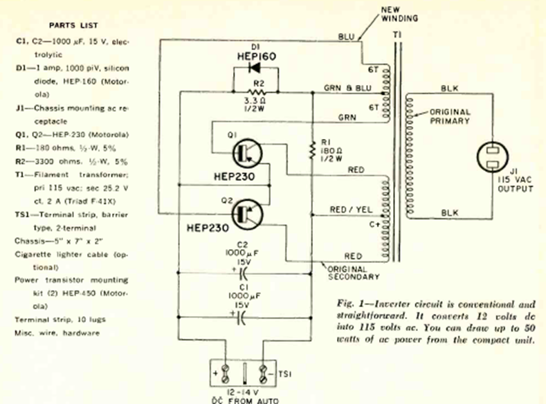 Este circuito suministra un voltaje de 115 VCA (no perfectamente sinusoidal) desde la batería de un automóvil. El circuito es de una Radio Electronics de diciembre de 1968.
