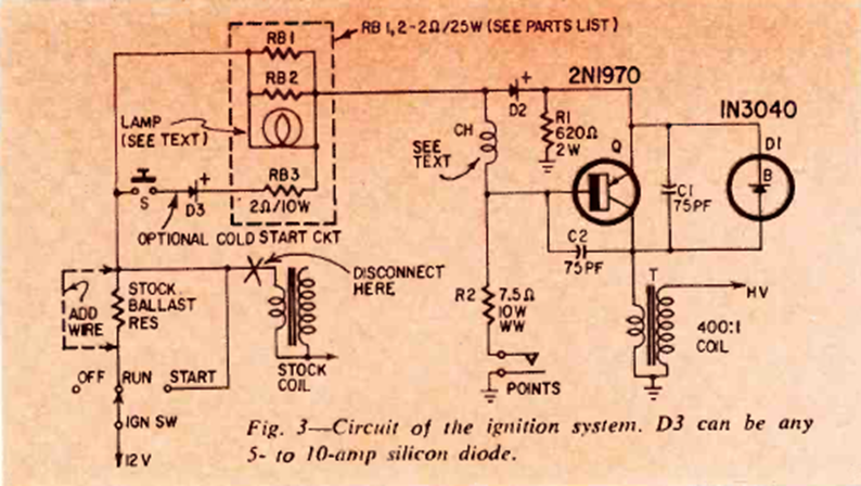 Este circuito lo encontramos en una Radio Electrónica de abril de 1965. Los componentes son de la época y la alimentación es para coches de 12 V. El transistor debe estar equipado con un buen radiador de calor.