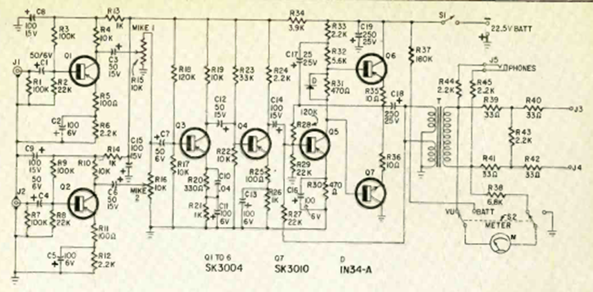 Este circuito bien diseñado fue publicado en la revista Radio Electronics en agosto de 1967 en un artículo que enseñaba cómo montarlo. Los transistores son de la época y el circuito se alimenta con una batería de 22,5 V.