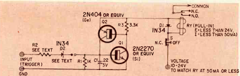 Este circuito de Radio Electronics de octubre de 1965 muestra cómo obtener la acción de un SCR al activar un relé utilizando dos transistores. El relé depende de la tensión de suministro del circuito.