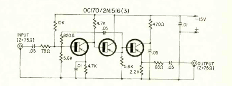 El rango de frecuencia de este circuito depende de los transistores utilizados. El circuito procede de una revista de Radio Electronics de junio de 1965. Los transistores utilizados son de la época con una frecuencia máxima de unos 28 MHz.