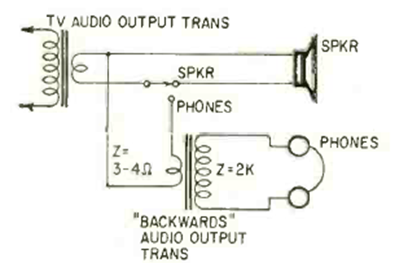 En la figura vemos cómo conectar un teléfono de alta impedancia a la salida de un amplificador de baja impedancia. En este caso no se incluyó el control de volumen. Se utiliza un transformador de salida para igualar las impedancias.