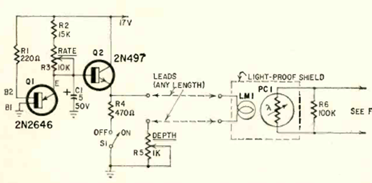 Este circuito acoplado ópticamente se encontró en la revista Radio Electronics de febrero de 1968. El circuito utiliza un LDR en modulación. Los transistores son tipos de la época.