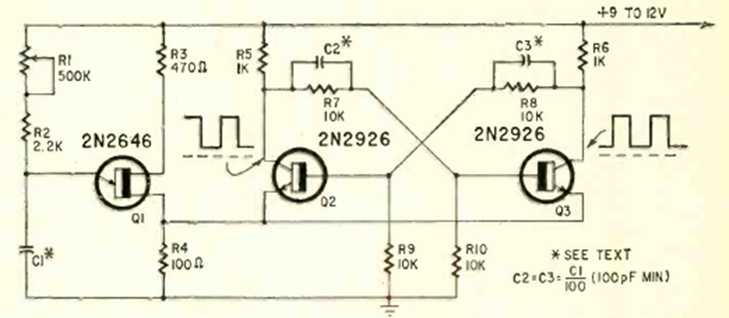 En este circuito, un transistor unijuntura controla un multivibrador que proporciona una señal rectangular con una frecuencia dada por el ajuste de P1 y C1. El circuito es de una Radio Electronics de julio de 1968.