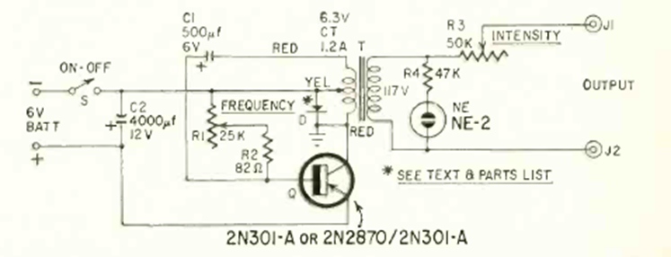Este pequeño generador de alta tensión alimentado por baterías fue encontrado en la revista Radio Electronics de junio de 1965. El transformador es el tipo de fuente de alimentación que determina la tensión generada.