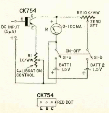 Encontramos en la revista Radio Electronics de junio de 1959 este circuito amplificador de corriente para medir corrientes muy bajas con un instrumento común de escala completa de 1 mA.