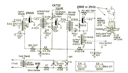 Descrito en un artículo que enseñaba cómo montar el intercomunicador completo en la revista Radio Electronics en septiembre de 1960, este amplificador utilizaba transistores comunes en la época.