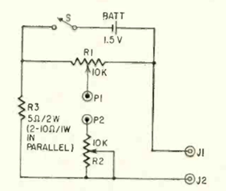 Con este circuito es posible medir resistencias bajas con un multímetro analógico común. El circuito es de una Radio Electrónica de octubre de 1965. Sólo hay que tener cuidado ya que la resistencia medida está atravesada por una corriente elevada.