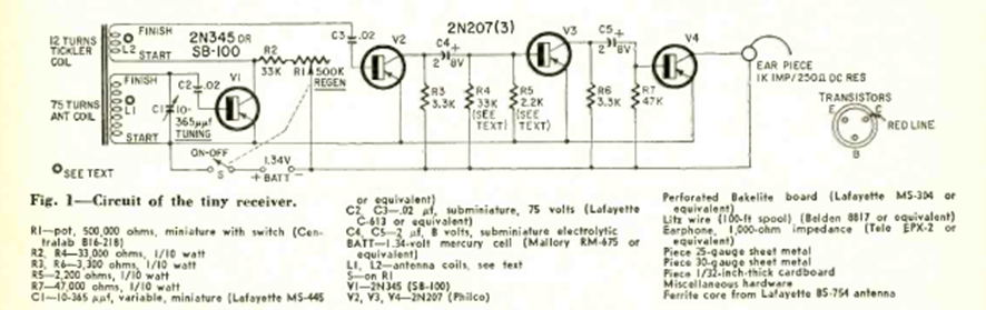 Escuchando con auriculares, esta radio regenerativa para el rango de onda media se publicó en la revista Radio Elecronics en marzo de 1962. El circuito tiene 4 transistores y buena sensibilidad..
