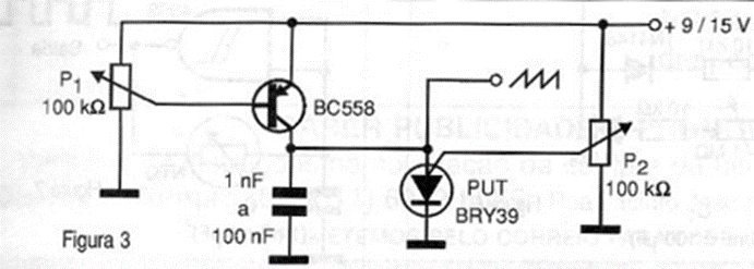 El circuito que se muestra en la figura 3 utiliza un transistor unijuntura programable (PUT) del tipo BRY39 y puede generar frecuencias entre unos pocos hercios y unos cientos de kilohercios. La fuente de alimentación es de 9 a 12 V y el punto de disparo y la linealidad uniforme deben ajustarse en el potenciómetro P2. La frecuencia debe configurarse en P1.
