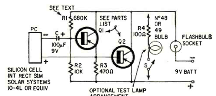 Este circuito para viejos flashes con lámparas de xenón se encontró en una revista de Radio Electronics de junio de 1966. El sensor es una célula fotoeléctrica de la época. La energía es suministrada por una batería de 9 V.