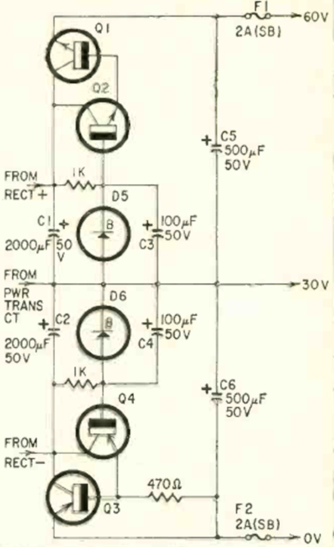 Este circuito se encontró en un Radio Electronics de junio de 1967. El regulador es adecuado para fuentes de alimentación de amplificadores de potencia con una salida de 0 – 30 – 60 V. El punto de 30 V se puede utilizar como tierra.