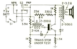Esta sencilla prueba de ganancia del transistor actúa como un oscilador para el transistor bajo prueba. El circuito es de una revista de Radio Electronics de agosto de 1960. La ganancia viene dada por un potenciómetro calibrado indicado en el punto donde se produce la oscilación.