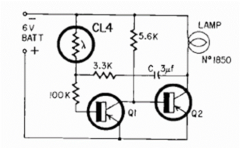 Este circuito publicado en la revista Radio Electronics de noviembre de 1964 alimenta una bombilla, pero puede funcionar con LED de alta potencia. La frecuencia la da el capacitorr. El circuito se activa cuando no hay luz en el sensor.