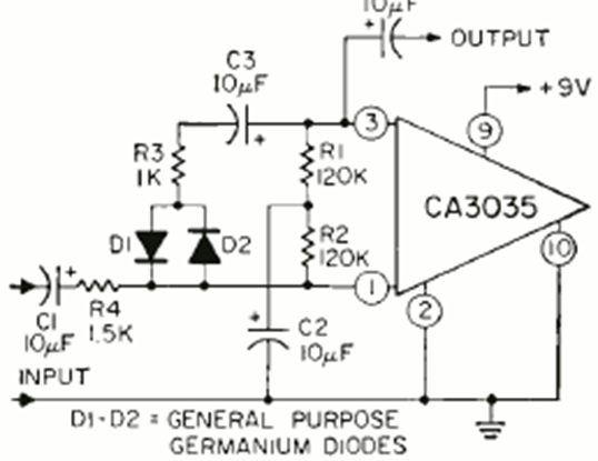 En este circuito, la ganancia disminuye cuando aumenta la intensidad de la señal de entrada. El circuito es de una revista de Radio Electronics de febrero de 1970. El circuito integrado es de RCA.