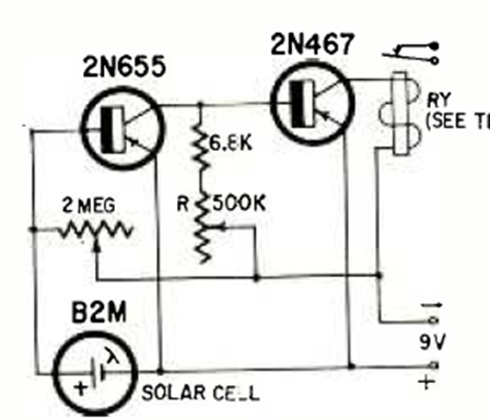 Este circuito fue encontrado en una Radio Electrónica de enero de 1965. El relé es de 9V, pero podemos cambiar la fuente de alimentación para usar relés de 6 o 5V. La sensibilidad se ajusta mediante los potenciómetros.