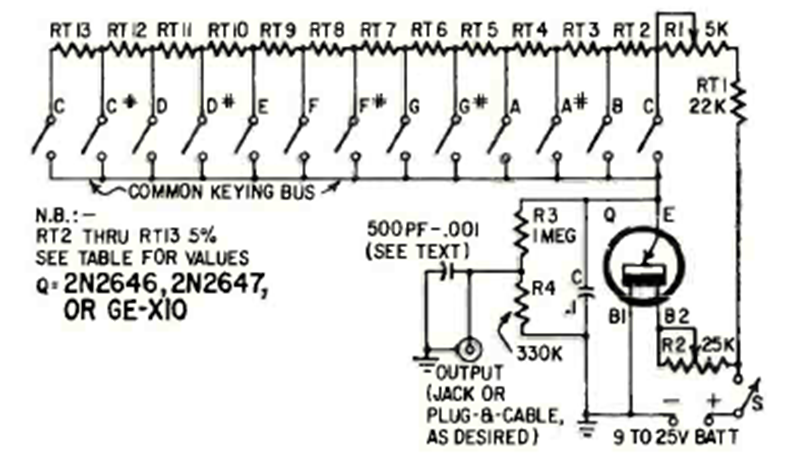 Este sencillo circuito con un transistor unijuntura apareció en la revista Radio Electronics en junio de 1966. La sintonización depende de los resistores. El circuito debe estar conectado a un amplificador de audio.