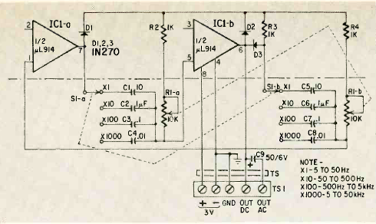 El generador de señales integrado apareció en la revista Radio Electronics en enero de 1968. Los circuitos integrados son de la época y el generador produce señales de 5 Hz a 50 kHz.