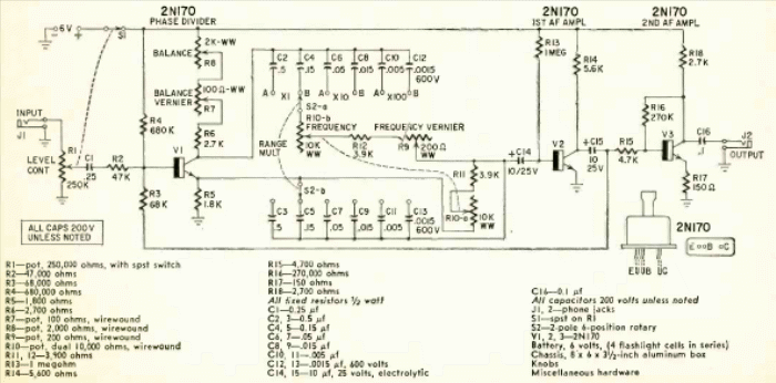 Encontramos este sofisticado circuito medidor en un artículo de la revista Radio Electronics de junio de 1959. El artículo enseñaba cómo montarlo. Los transistores eran tipos comunes en ese momento.