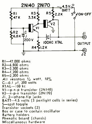 Este conocido oscilador con transistores complementarios se encontró en la revista Radio Electronics de noviembre de 1960. El circuito está controlado en frecuencia por un cristal de 100 kHz.
