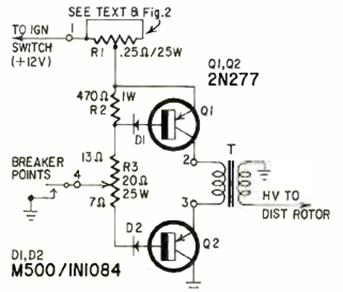 Este circuito de encendido asistido (que reduce la corriente de chispa) se remonta a la época en que los coches tenían bujías. El transistor realizó la conmutación con mejor rendimiento. El circuito es de una Radio Electronics de julio de 1963.