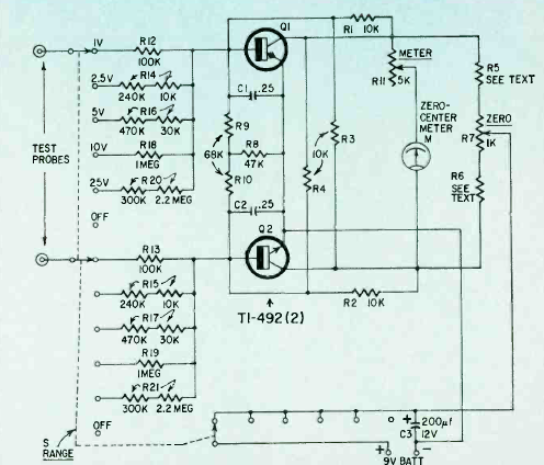 Este sensible circuito de dos transistores se encontró en la revista Radio Electronics de junio de 1965. El circuito tiene baja deriva y utiliza un instrumento analógico. La resistencia de entrada es muy alta.