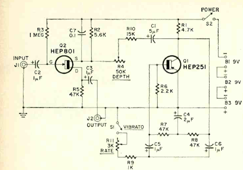 Este circuito de efectos de sonido se obtuvo de un artículo de la revista Radio Electronics de abril de 1969. Los dos transistores son tipos de uso generalizado en la época que admiten equivalentes actuales. La alimentación proviene de 3 baterías de 9 V.