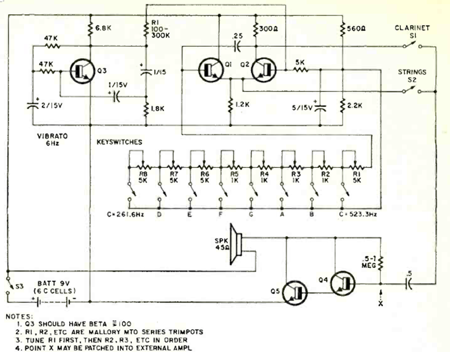 Este órgano de transistores de juguete se encontró en la revista Radio Electronics de mayo de 1970. Los trimpots se ajustan a las notas musicales según la llave.