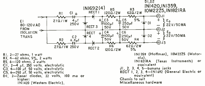 Este sencillo circuito de baja corriente se encontró en una revista de Radio Electronics de agosto de 1960. El circuito no utiliza transistores en la regulación, sino sólo zeners directamente.