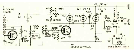 Este circuito apareció en una revista de Radio Electronics en marzo de 1962. El circuito utiliza dos transistores de la época y consta de un oscilador. La indicación es a través de lámparas de neón.