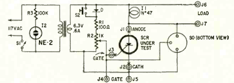 Este circuito es de Radio Electronics de marzo de 1967. El circuito se aplica a SCR de uso general como el TIC106, C106 y otros. La prueba se realiza aumentando la tensión de la puerta hasta el punto de activación.
