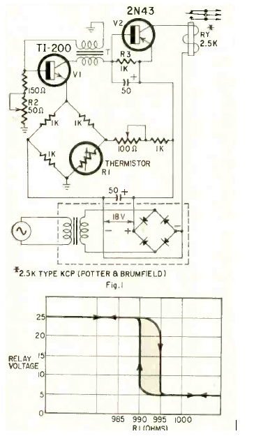 Este circuito de dos transistores utiliza un LDR como sensor en una configuración de puente. El circuito es de una Radio Electronics de julio de 1961. La alimentación proviene de la red eléctrica.