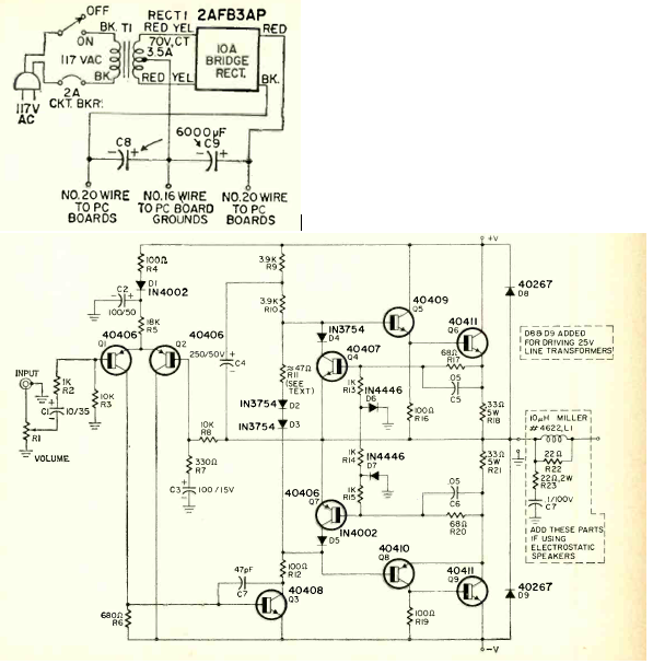 El montaje de este amplificador fue descrito en un artículo de la revista Radio Electronics de abril de 1969. Los transistores eran tipos de potencia en la época y la salida es complementaria sin necesidad de utilizar transformador. La tensión de alimentación es alta procedente de un transformador de 70 V x 3,5 A.