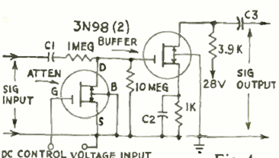 Este circuito tiene su ganancia determinada por el voltaje CC de control. El circuito es de una Radio Electrónica de mayo de 1967. La ganancia se puede ajustar hasta 60 dB o 70 dB de atenuación. Los transistores son MOSFET de la época.