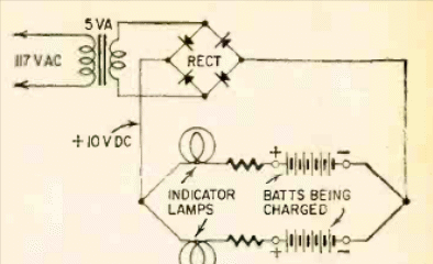 Este sencillo circuito de cargador de batería se encontró en una radioelectrónica de junio de 1959. Las resistencias dependen de la tensión del transformador, la tensión de la lámpara y la corriente de carga.