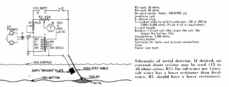 La idea de este interesante detector es detectar los cambios de conductividad que se producen con la presencia de un objeto metálico enterrado en el fondo de un río o del mar. El circuito es de una Radio Electronics de julio de 1960.