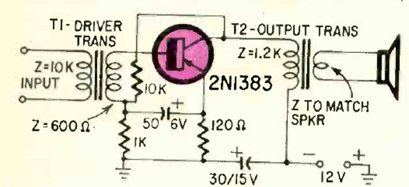Este circuito es de una Radio Electronics de octubre de 1963. El transistor es un transistor de potencia de la época y se utilizan dos transformadores. La entrada tiene una impedancia de 10k y se alimenta con 12 V.
