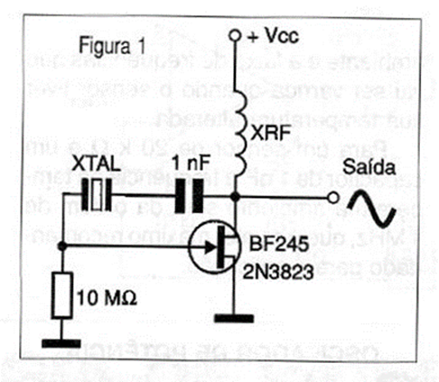 El oscilador ilustrado en la figura se puede utilizar para generar señales que van desde 100 kHz hasta unas pocas decenas de megahercios, según el cristal utilizado. La fuente de alimentación se puede suministrar con voltajes de 9 a 15 V y el condensador en serie con el cristal debe ser cerámico. La descarga de RF es de 1 mH para una frecuencia entre 100 kHz y 1 MHz y puede reducirse para frecuencias más altas. El transistor de efecto de campo de unión (JFET) admite equivalentes como el BF245 y el MPF102.