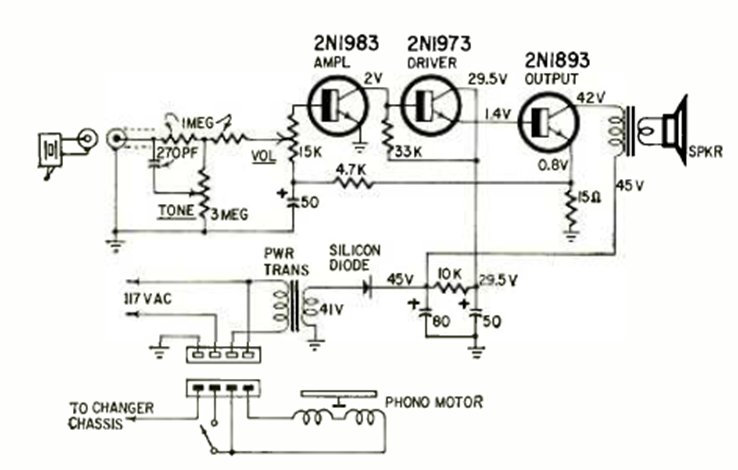 Este circuito amplificador de audio se encontró en la revista Radio Electronics de junio de 1966. El circuito es de tipo RCA comercial y funciona con la red eléctrica.