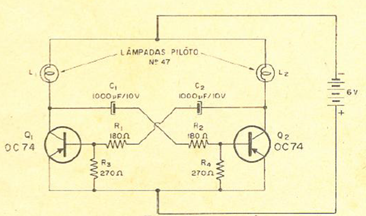Este circuito intermitente consta de un multivibrador astable con las frecuencias dadas por los capacitores. El circuito es del año 1965 y utiliza bombillas, pero se pueden utilizar LED. La alimentación proviene de 4 pilas.