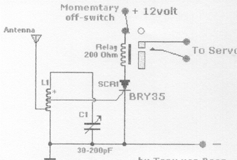 Este circuito utiliza como componentes activos un SCR que opera sólo en distancias cortas. El circuito fue encontrado en documentación de los años 90. La bobina tiene 3 + 5 + 5 vueltas de cable 28 en forma de 0,5 cm para funcionar en la banda de 27 MHz.